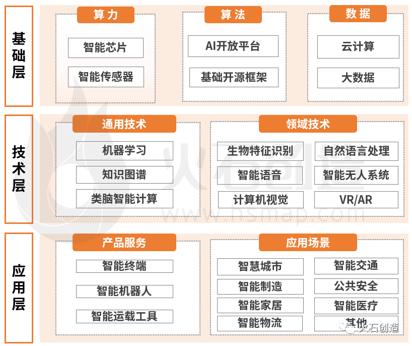 人工智能产业链分为三层:基础层、技术层以及应用层。基础层涉及数据收集与运算,这是人工智能的发展基础,包括智能芯片、智能传感器、大数据与云计算等;技术层处理数据的挖掘、学习与智能处理,是连接基础层与应用层的桥梁,包括机器学习、类脑智能计算、计算机视觉、自然语言处理、智能语音、生物特征识别等;应用层是将人工智能技术与行业的融合发展的应用场景,包括智能机器人、智能终端、智慧城市、智能交通、智能制造、智能医疗、智能教育等。