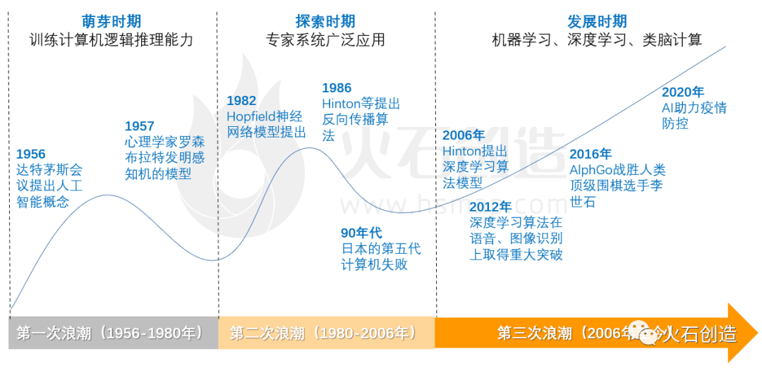 从1956年“人工智能”概念在达特茅斯会议上首次被提出至今,人工智能发展已经历经60余年,经历了三次发展浪潮。当前全球人工智能正处于第三次发展浪潮之中。